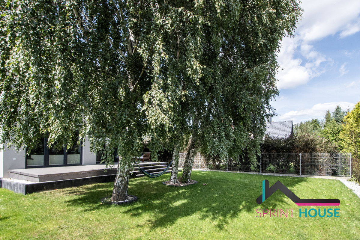 Od strony ogrodu znajduje się duży taras i balkon. W ogrodzie rosną piękne drzewa, zewsząd mamy widok na zieleń.