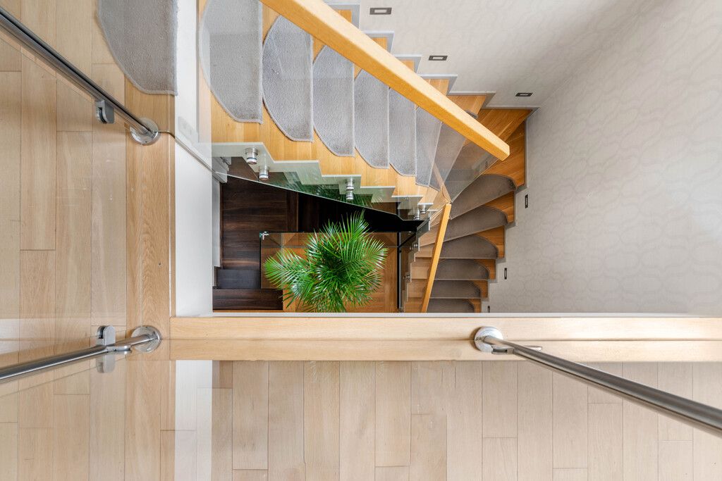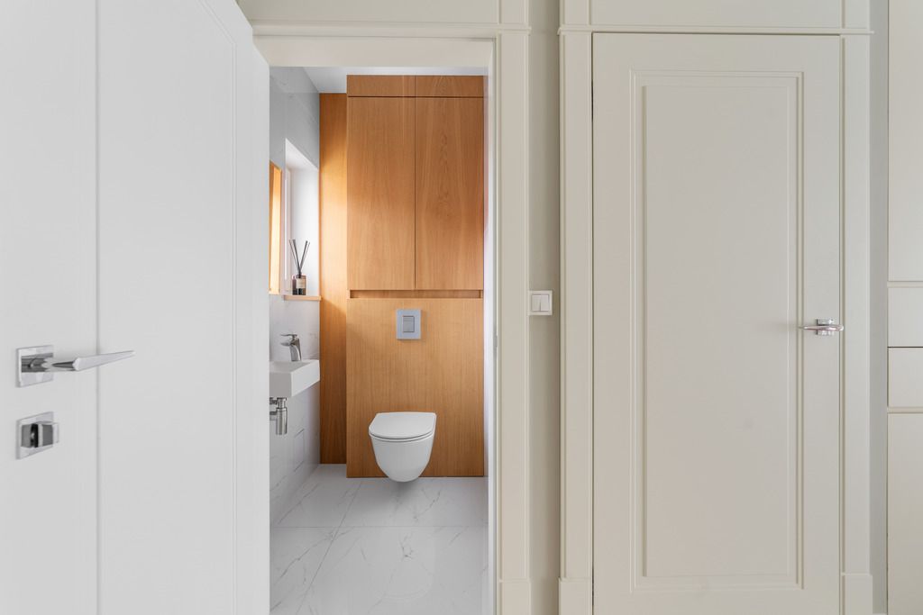 Dom jest wykończony w eleganckim, uniwersalnym stylu, z dbałością o szczegóły. Zabudowy stolarskie na wymiar są idealnie wpasowane w przestrzeń. Podłogi i schody wykonane są z litego drewna. Kuchnia w zabudowie na wymiar, fronty fornirowane, blat kamienny, sprzęt AGD.
