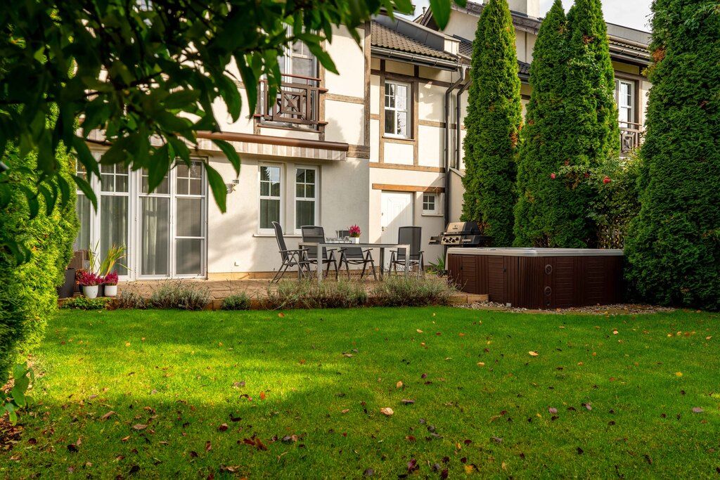 Taras z kamienia i zadbany ogród tworzą idealną przestrzeń do relaksu i odpoczynku – oprócz zieleni, mamy przestrzeń do grillowania oraz jacuzzi.