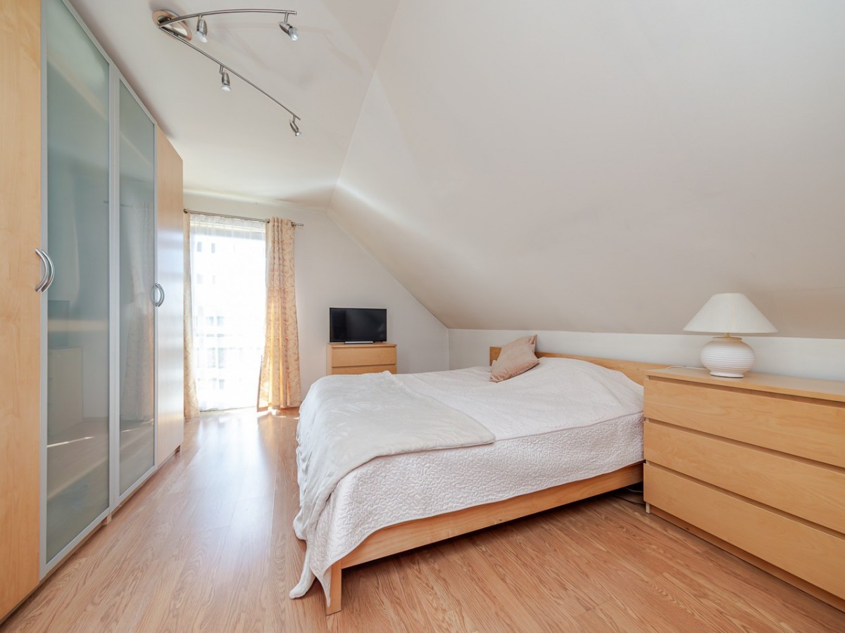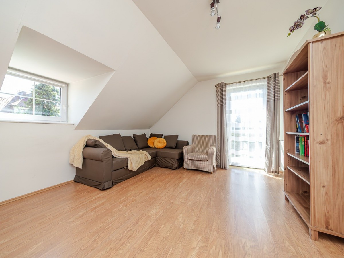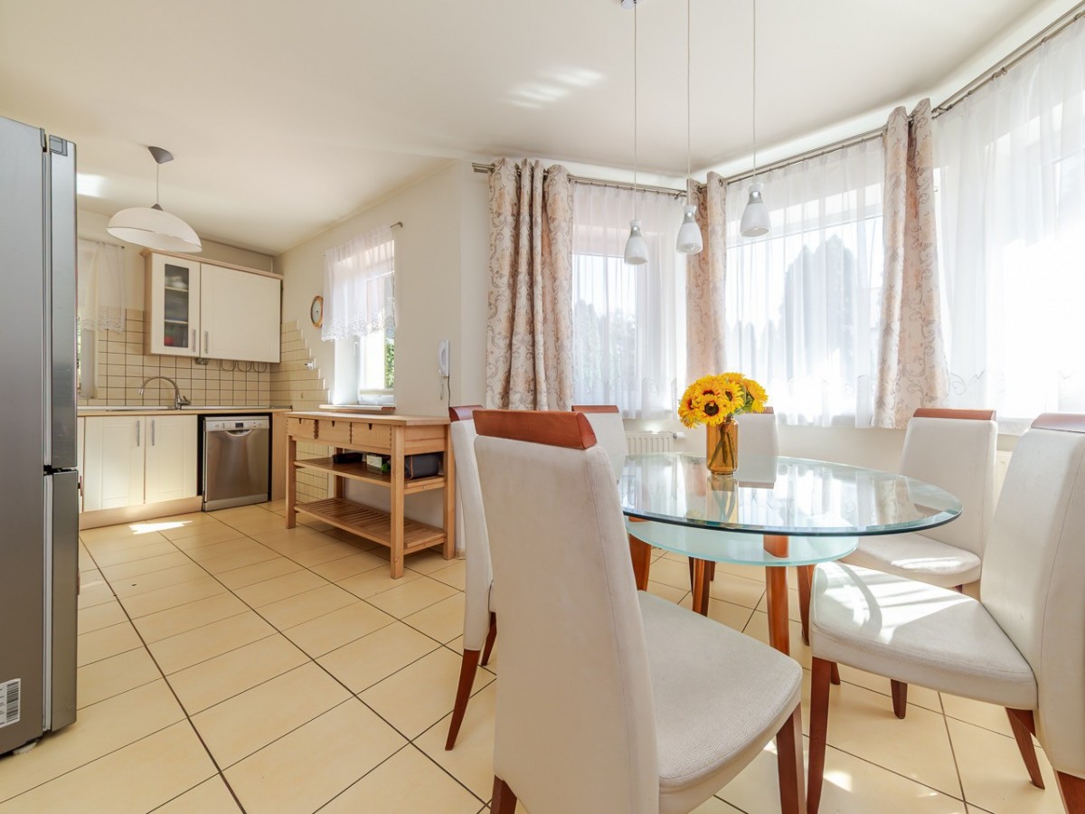 Dom oferuje ok. 113,7 m² powierzchni użytkowej, 132,9m2 powierzchni całkowitej oraz funkcjonalny rozkład pomieszczeń: przestronny salon z wyjściem na taras i ogród, oddzielna, jasna kuchnia, 3 pokoje, dwie łazienki, dodatkowa przestrzeń do przechowywania na poddaszu, garaż w bryle budynku oraz praktyczna piwniczka/schowek pod schodami.