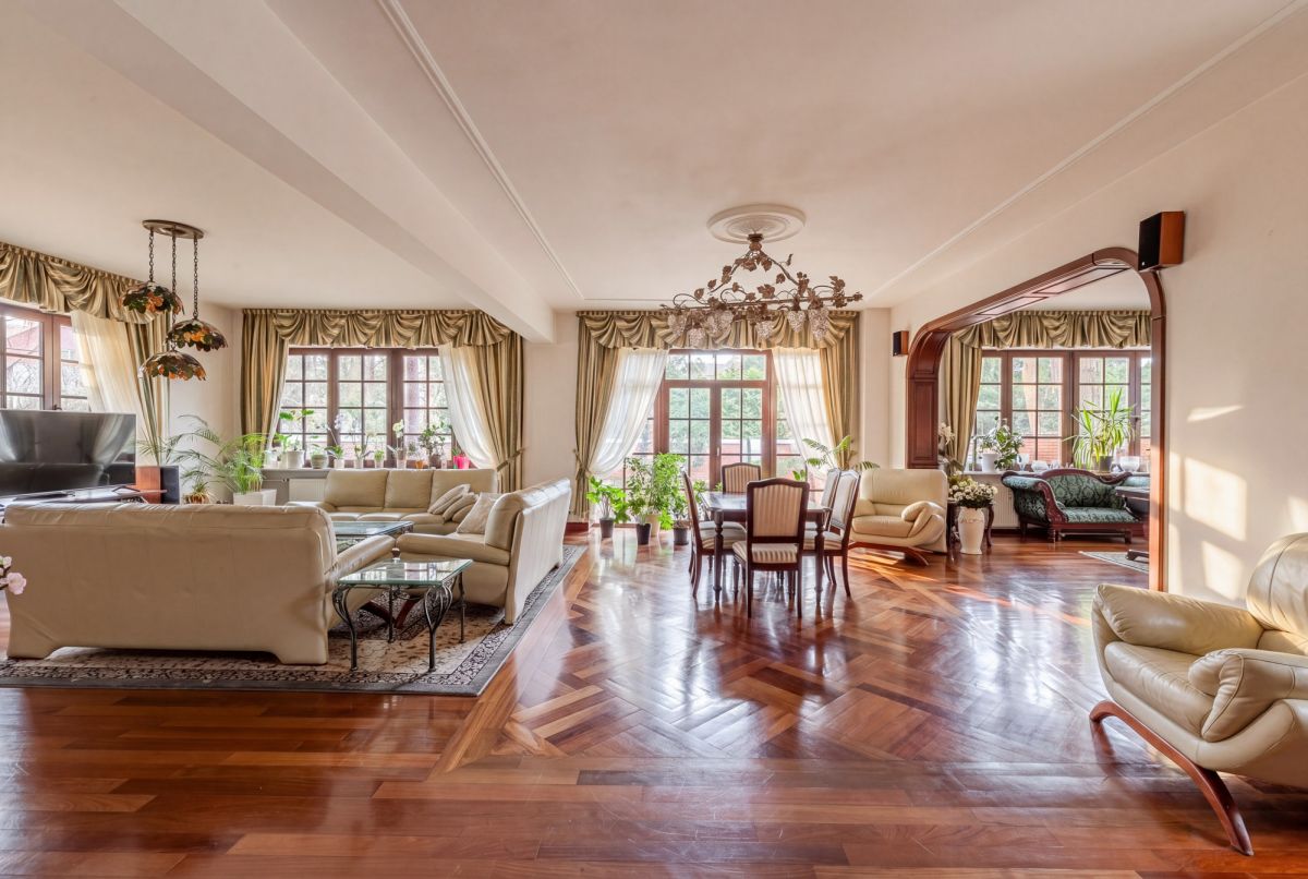 Przestronny salon wykończony egzotycznym drewnem tworzy reprezentacyjne serce domu i płynnie łączy się z oranżerią, która stanowi idealne miejsce do wypoczynku i spotkań.