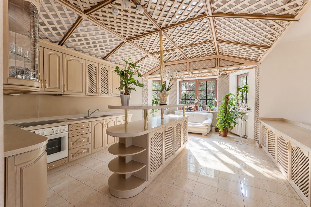 Kuchnia oraz wybrane elementy parteru zostały wykonane z Corianu, co podkreśla wysoki standard wykończenia.