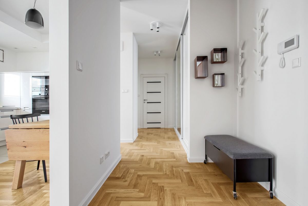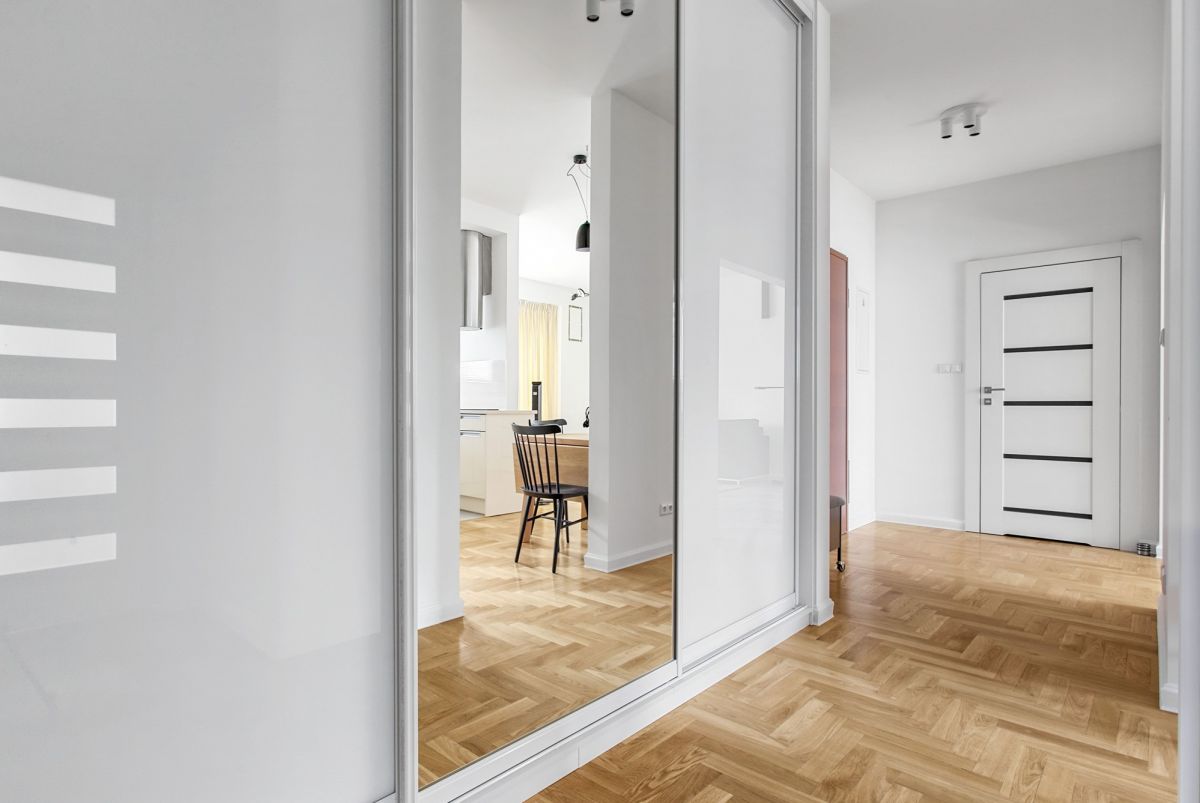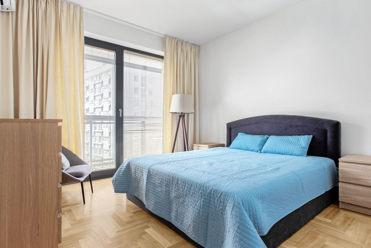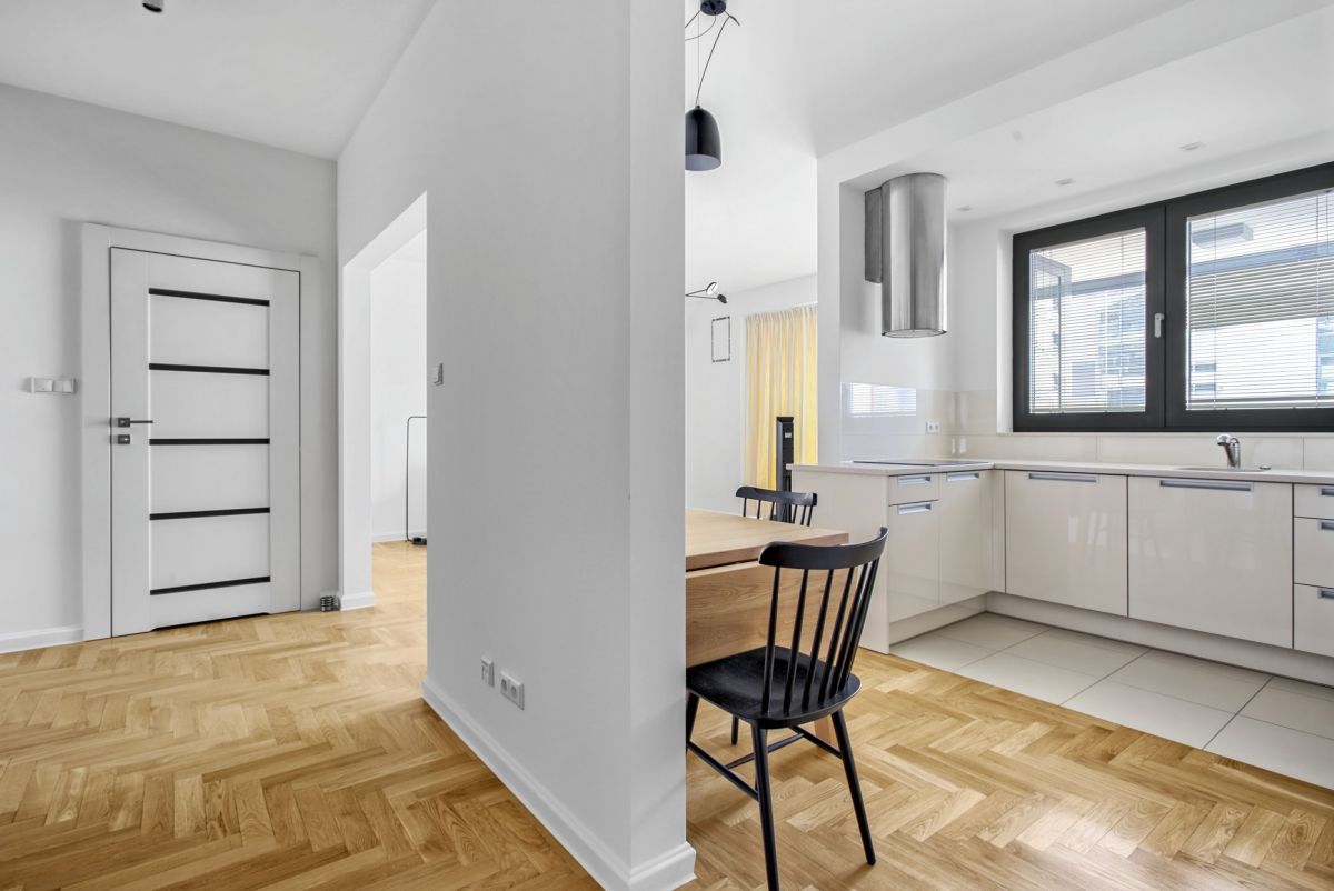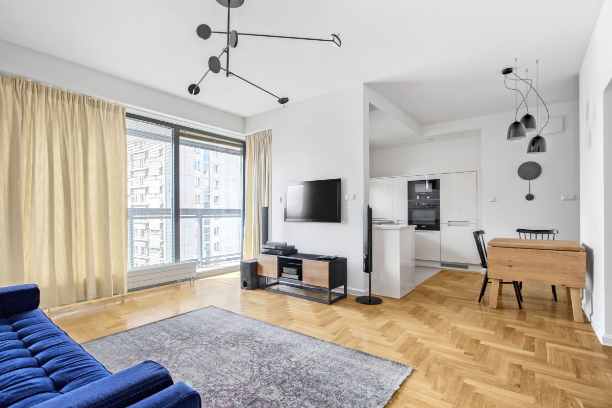 The property has an area of 63 m2 and is located on the 10th floor. It consists of two rooms, including a living room with a semi-open kitchen, one bedroom, two bathrooms and a balcony. The apartment comes with a parking spot in the underground garage, paid additionally 100.000 PLN.