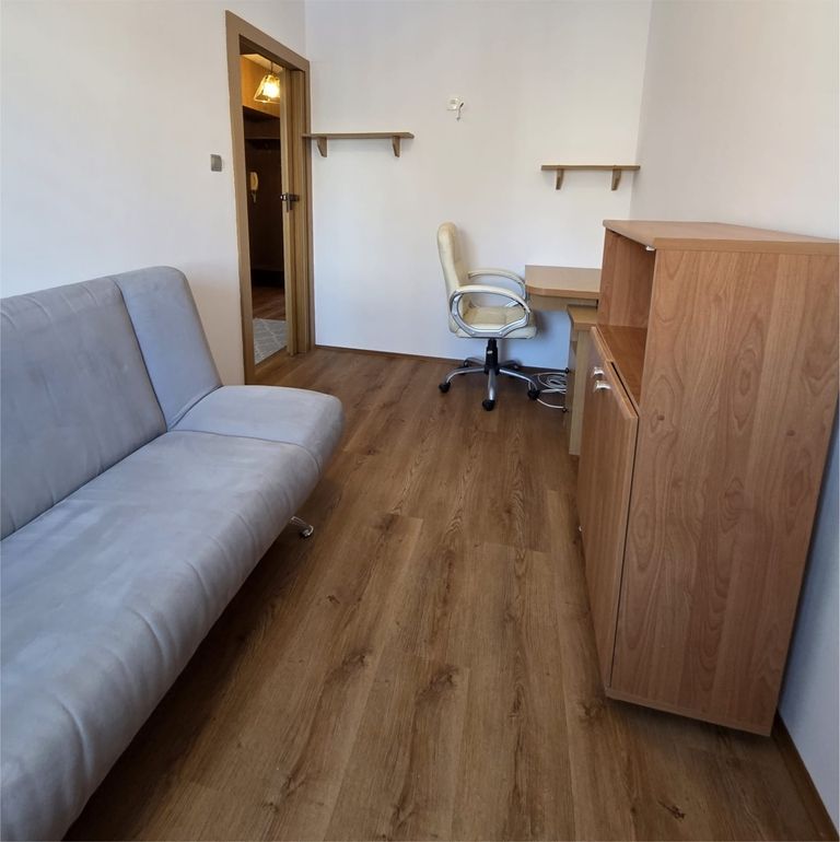 - Pokój z biurkiem do pracy, rozkładaną kanapą i telewizorem,