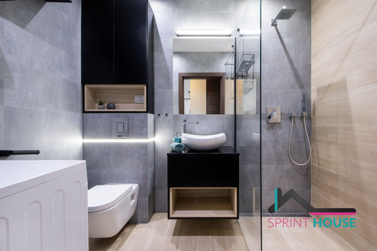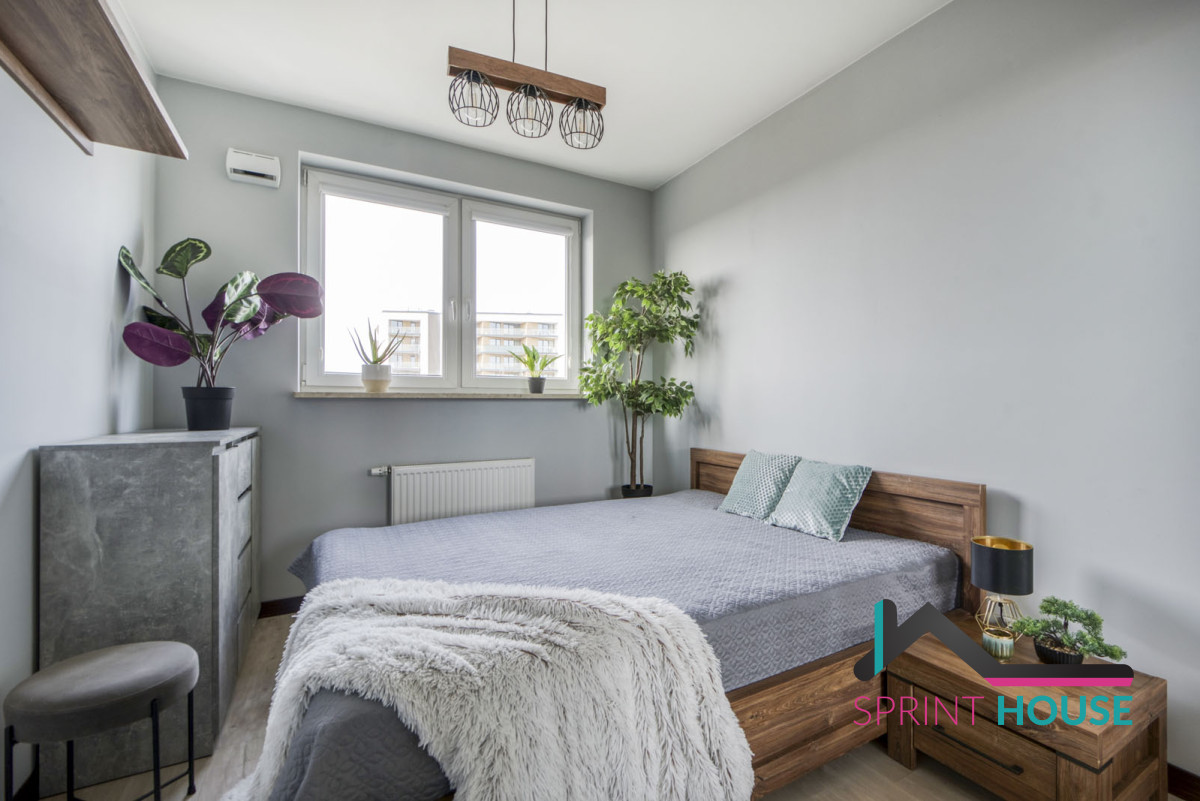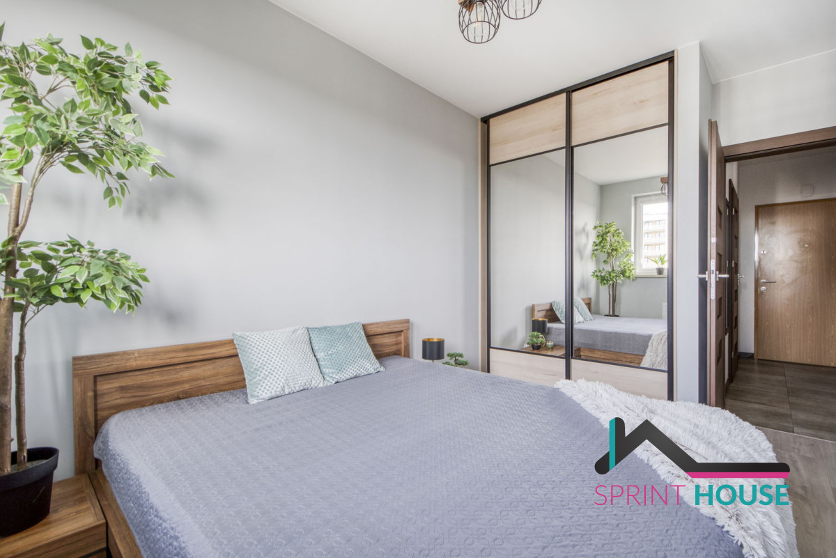 Przede wszystkim funkcjonalnie urządzona przestrzeń. Wejście do mieszkania do przedpokoju z praktyczną szafą w zabudowie. Po prawej łazienka z WC urządzona, po lewej salon z rozkładaną kanapą, stolikiem, stołem z krzesłami oraz telewizorem, na wprost wejścia sypialnia z łóżkiem i szafą w zabudowie.