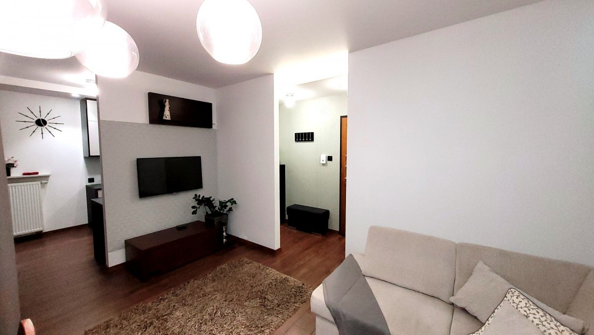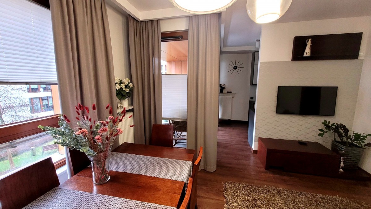 - jasny, komfortowo umeblowany salon z wyjściem na balkon (rozkładany narożnik, stolik kawowy, szafka RTV, telewizor, stół z 6 krzesłami, witryna), częściowo otwarty na kuchnię,