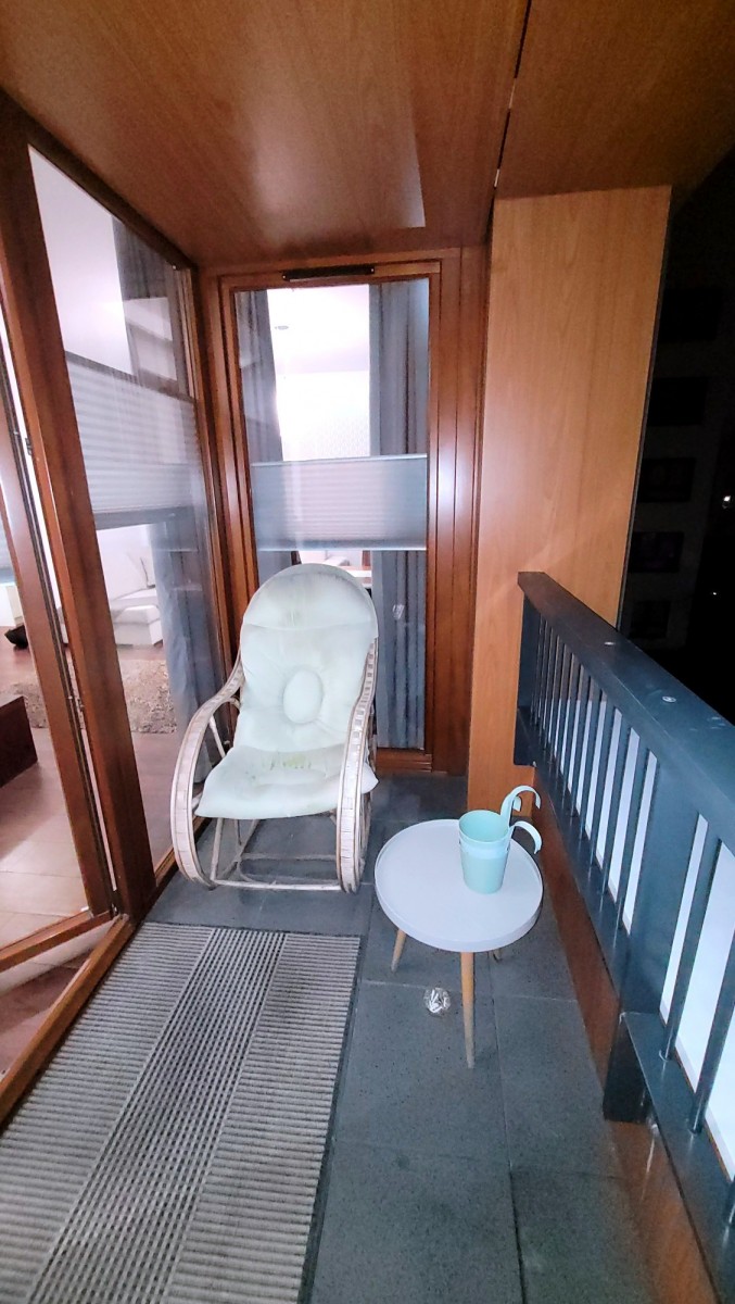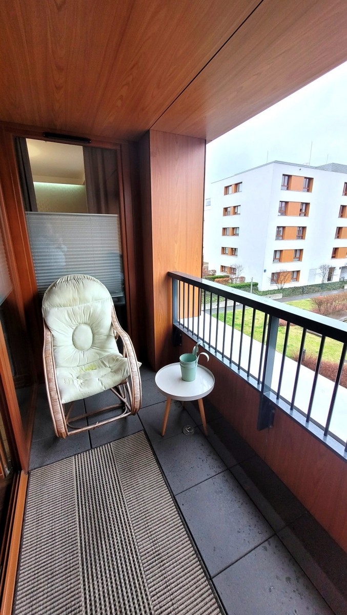 Dodatkowym atutem jest balkon z widokiem na zielone patio - idealne miejsce do relaksu (wyposażony m.in. w fotel bujany).