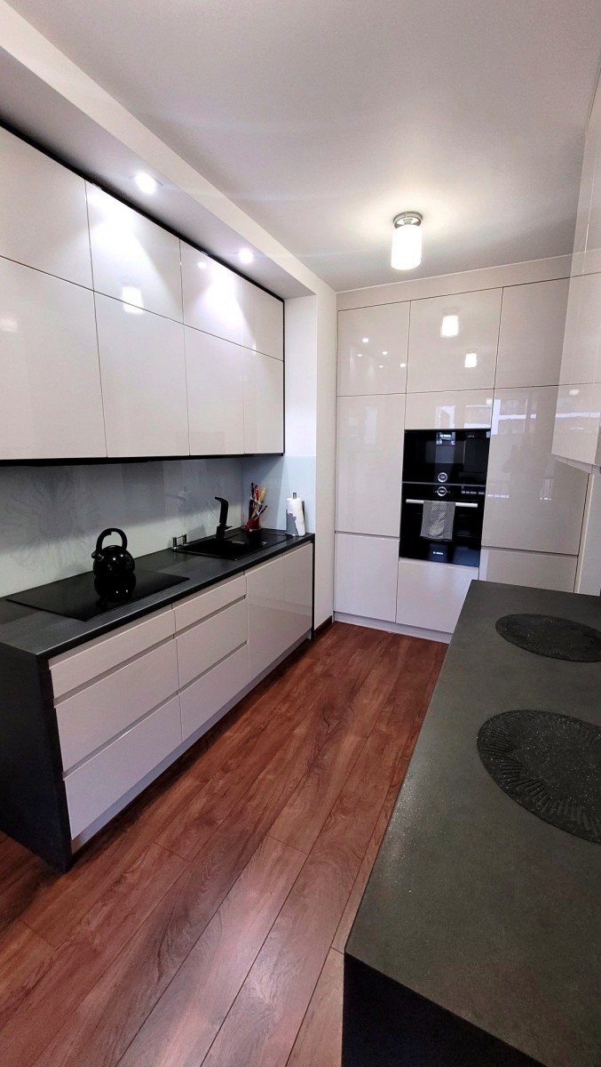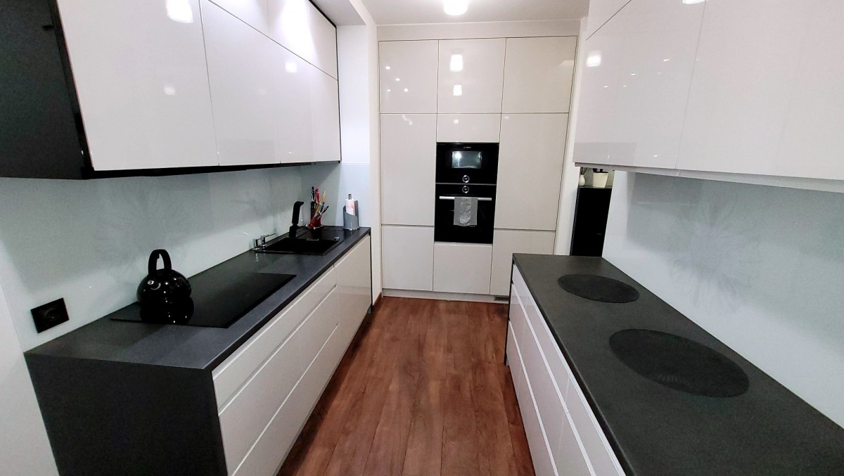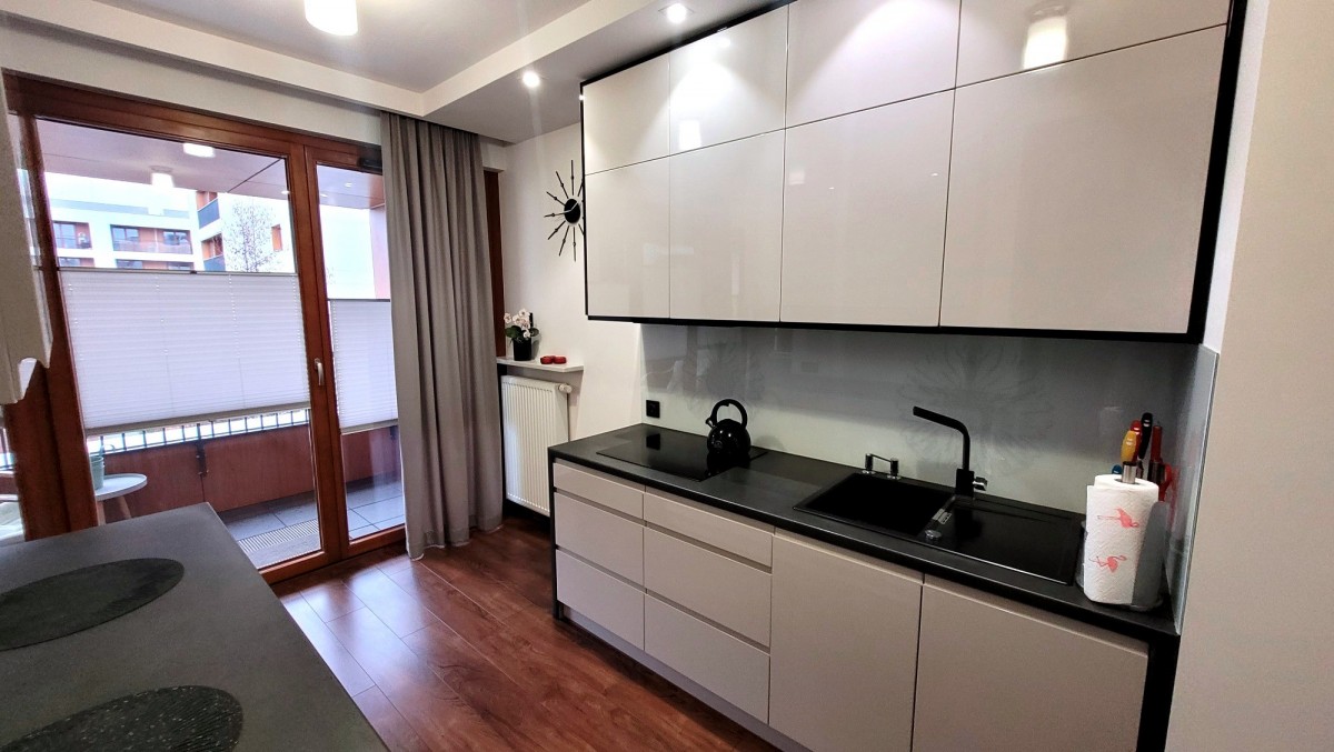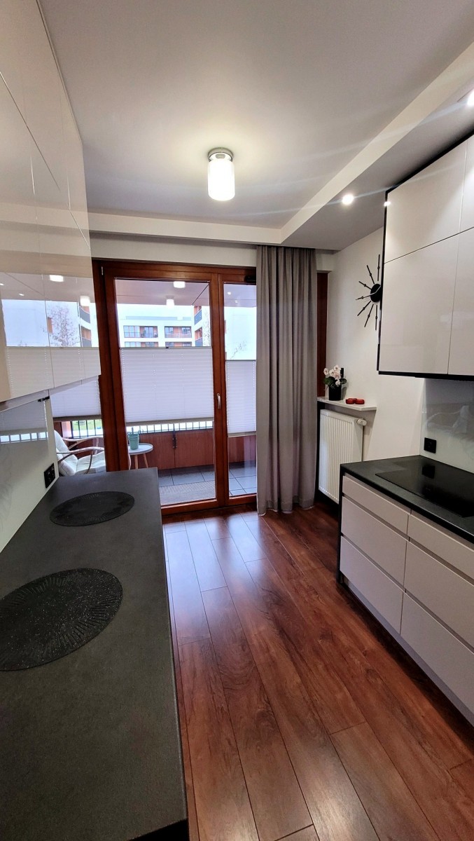 - nowoczesna kuchnia w pełnej zabudowie, wyposażona w wysokiej klasy sprzęt AGD (lodówka, płyta indukcyjna, piekarnik, kuchenka mikrofalowa, zmywarka), również z wyjściem na balkon,