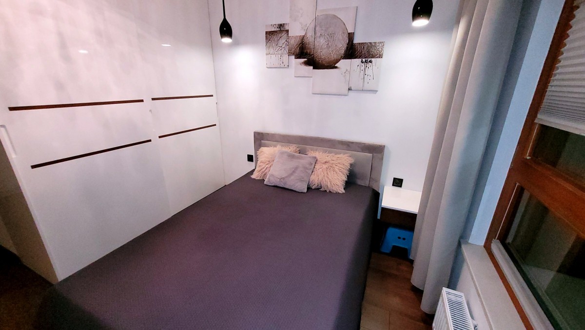 - przytulna sypialnia z dużym oknem, łóżkiem dwuosobowym, szafą w zabudowie oraz funkcjonalną przestrzenią do pracy (biurko, półki),
