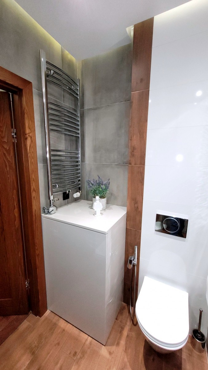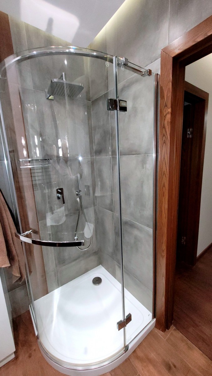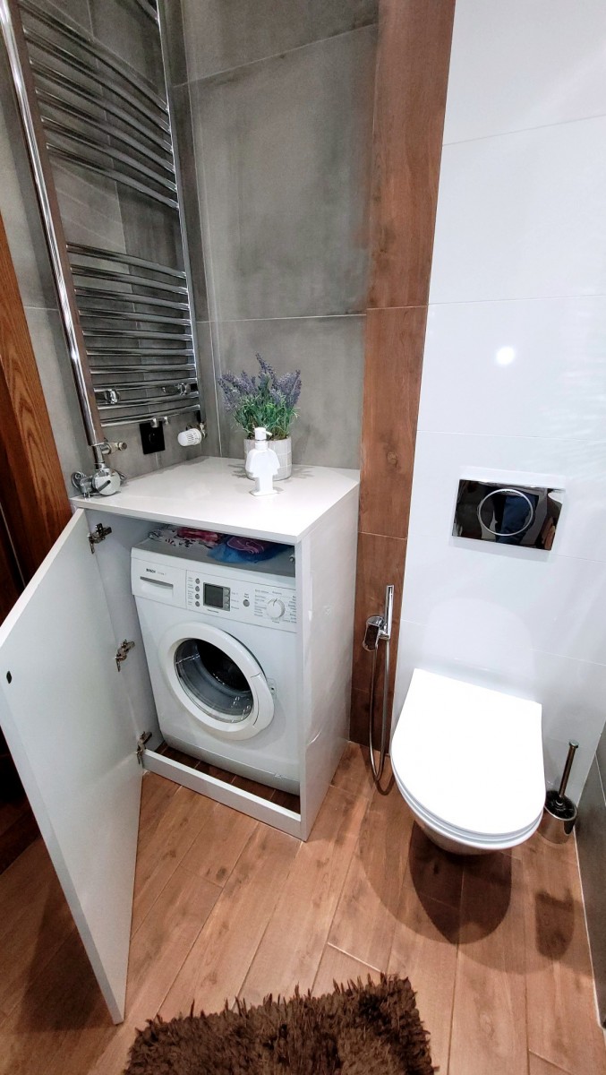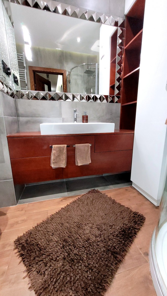 - elegancka łazienka z kabiną prysznicową, umywalką, zabudową meblową, lustrem oraz pralką.