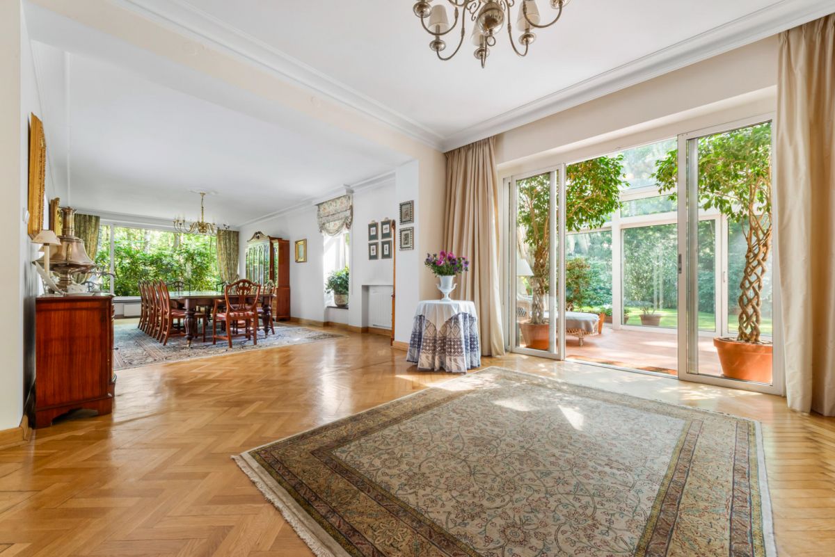 Spacious, representative living room with a fireplace, connected to the dining area and winter garden - together over 72 m²