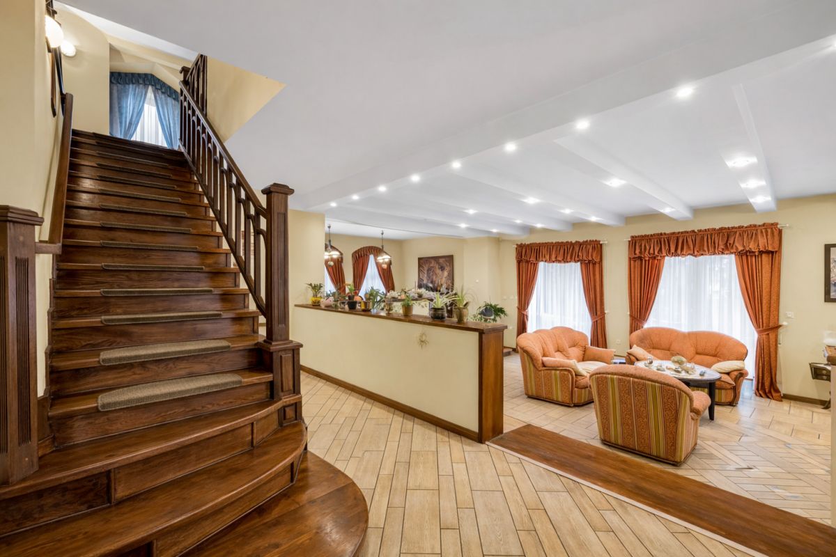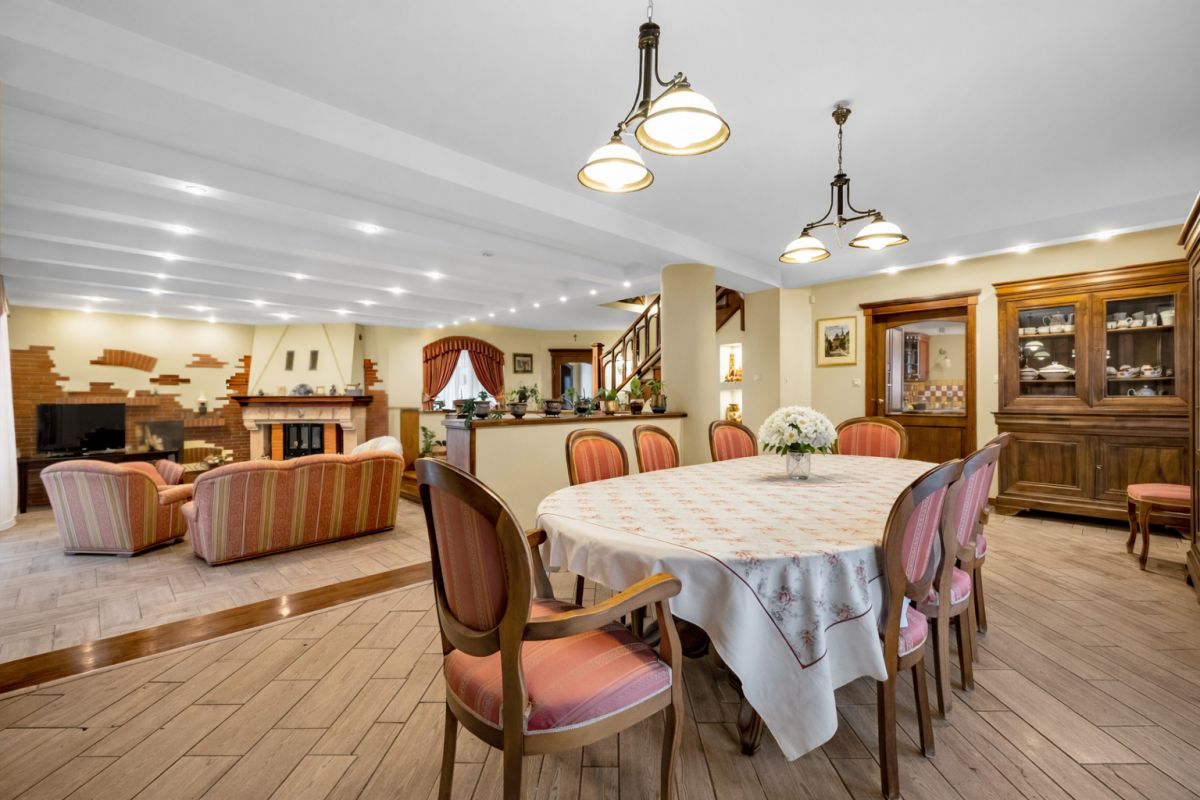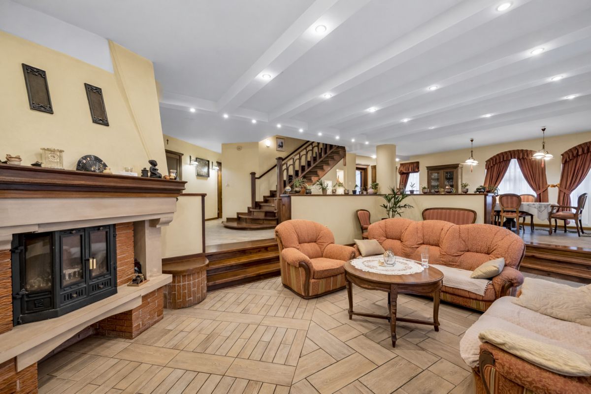 - Przestronny salon z kominkiem z wyjściem na taras, drewniany parkiet i terakota [29 m²]