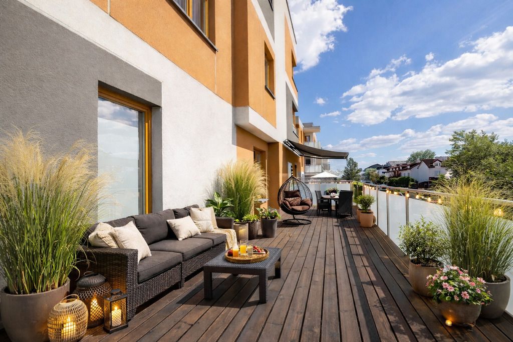 Poranna kawa w słońcu, rośliny na tarasie i długie, spokojne letnie wieczory na świeżym powietrzu. Ten 40-metrowy taras dostępny z każdego pokoju sprawia, że mieszkanie żyje nie tylko wewnątrz, ale także na zewnątrz.