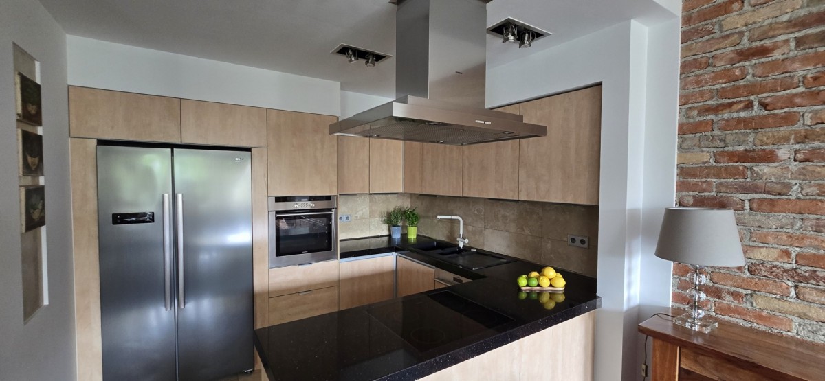 Salon z aneksem kuchennym - przestrzeń idealna do relaksu i wspólnych posiłków: dwie wygodne, eleganckie sofy, stół dla 4 osób, klimatyzacja, w pełni wyposażona kuchnia (lodówka, płyta elektryczna, piekarnik, blat roboczy, liczne szafki)