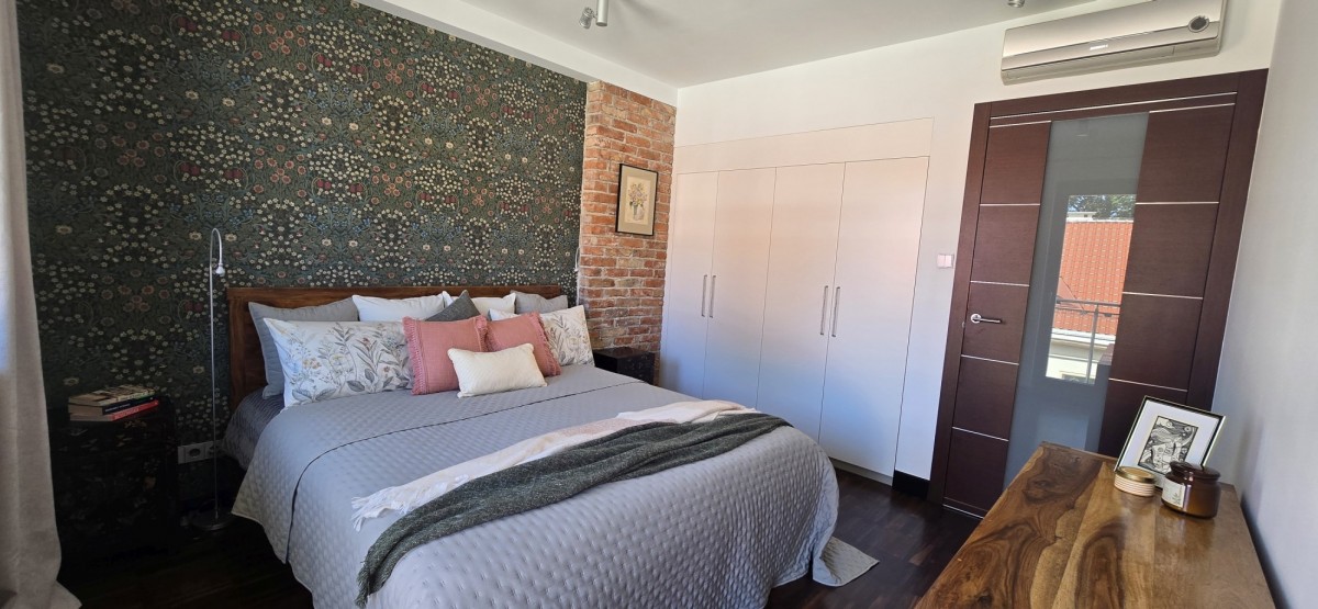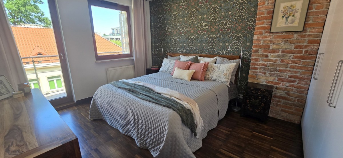 Sypialnia główna - podwójne łóżko, duża szafa w zabudowie, mnóstwo naturalnego światła, wyjście na balkon, klimatyzacja